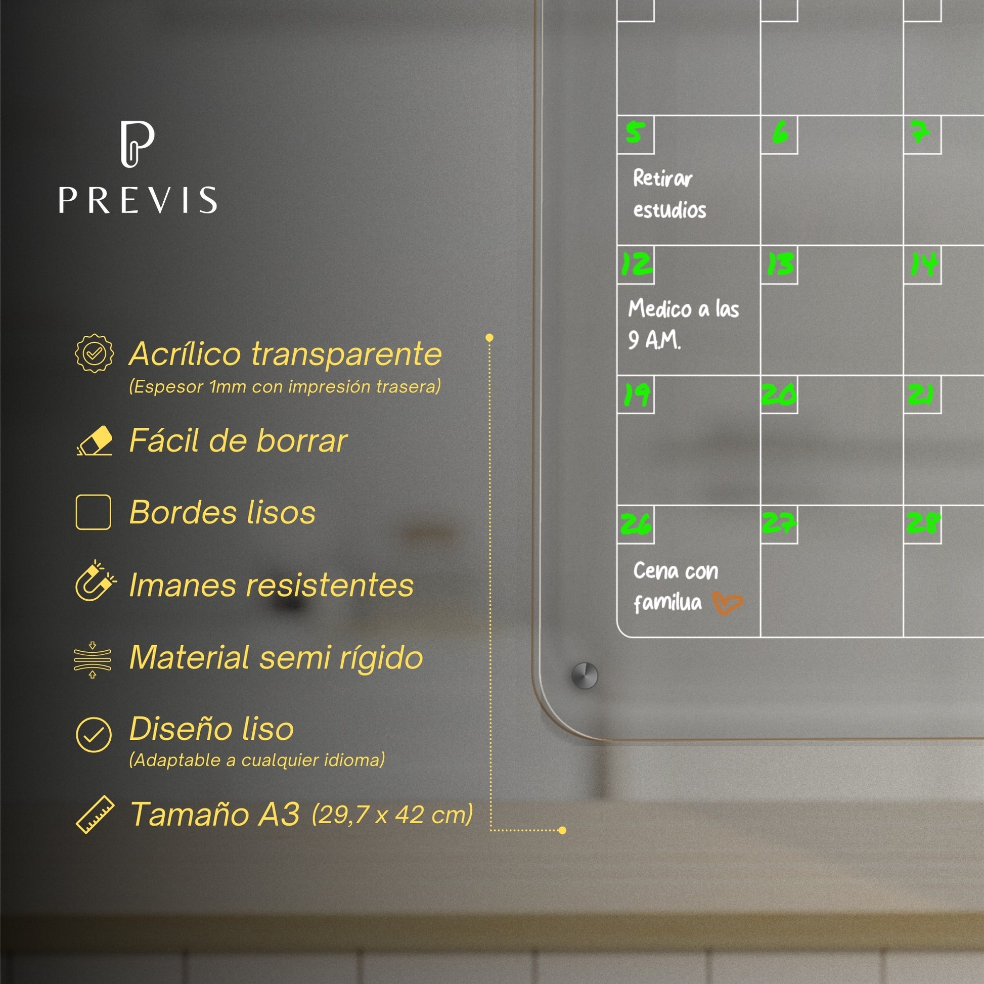 - ✅𝐌𝐀𝐓𝐄𝐑𝐈𝐀𝐋 𝐓𝐑𝐀𝐍𝐒𝐏𝐀𝐑𝐄𝐍𝐓𝐄 𝐀𝐂𝐑Í𝐋𝐈𝐂𝐎: La pizarra esta fabricada en España bajo un material acrílico transparente de 1mm con impresión trasera de diseño de calendario mensual en negro.